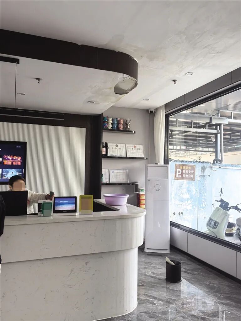 酒店一楼天花板渗水受损。